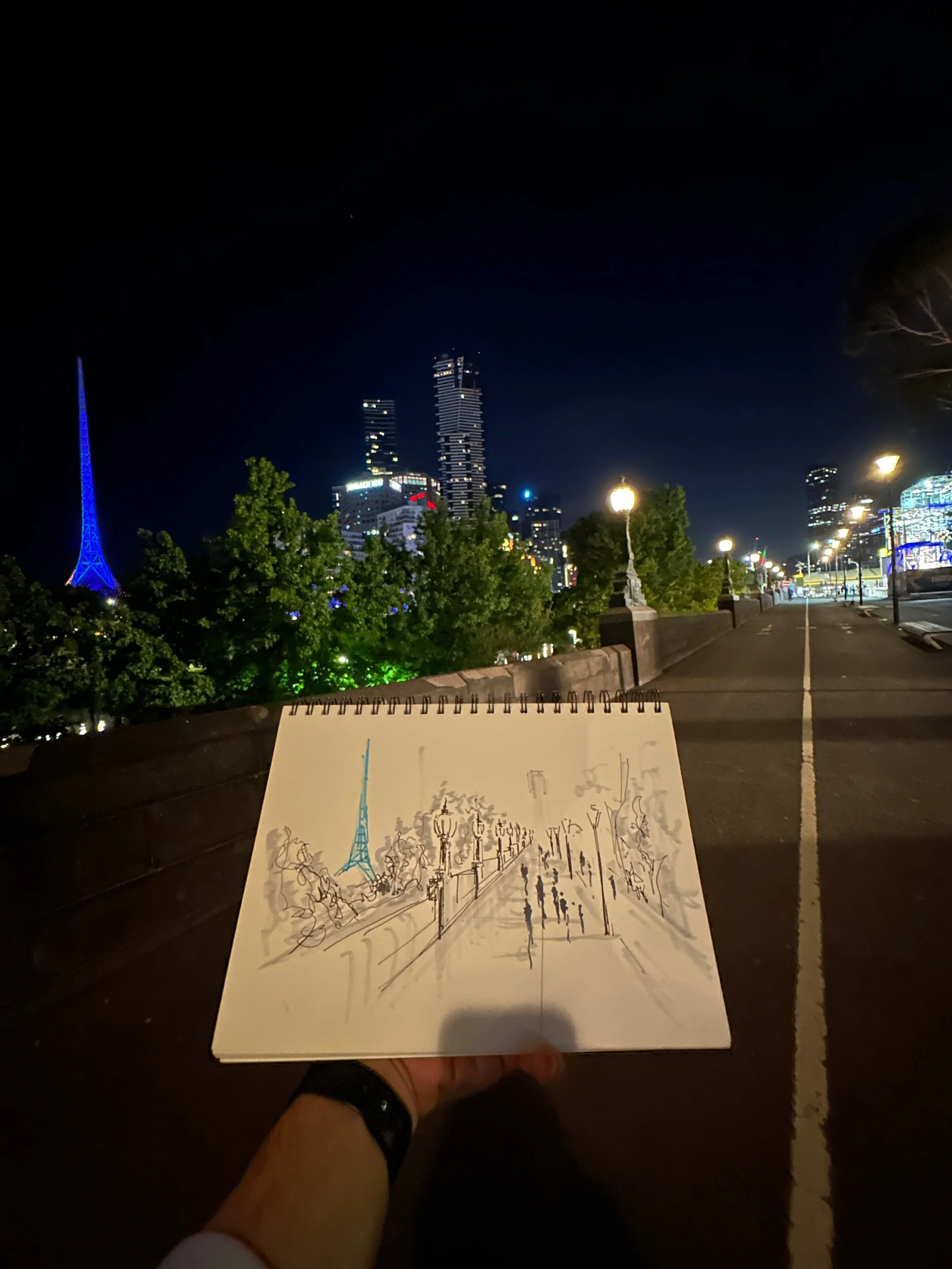 Created on the evening of the last night of The Australian Open as the crowds began to walk back to Flinders Street Station and the lights fade to create a glow around the arts spire which was light in the Australian Open colours.