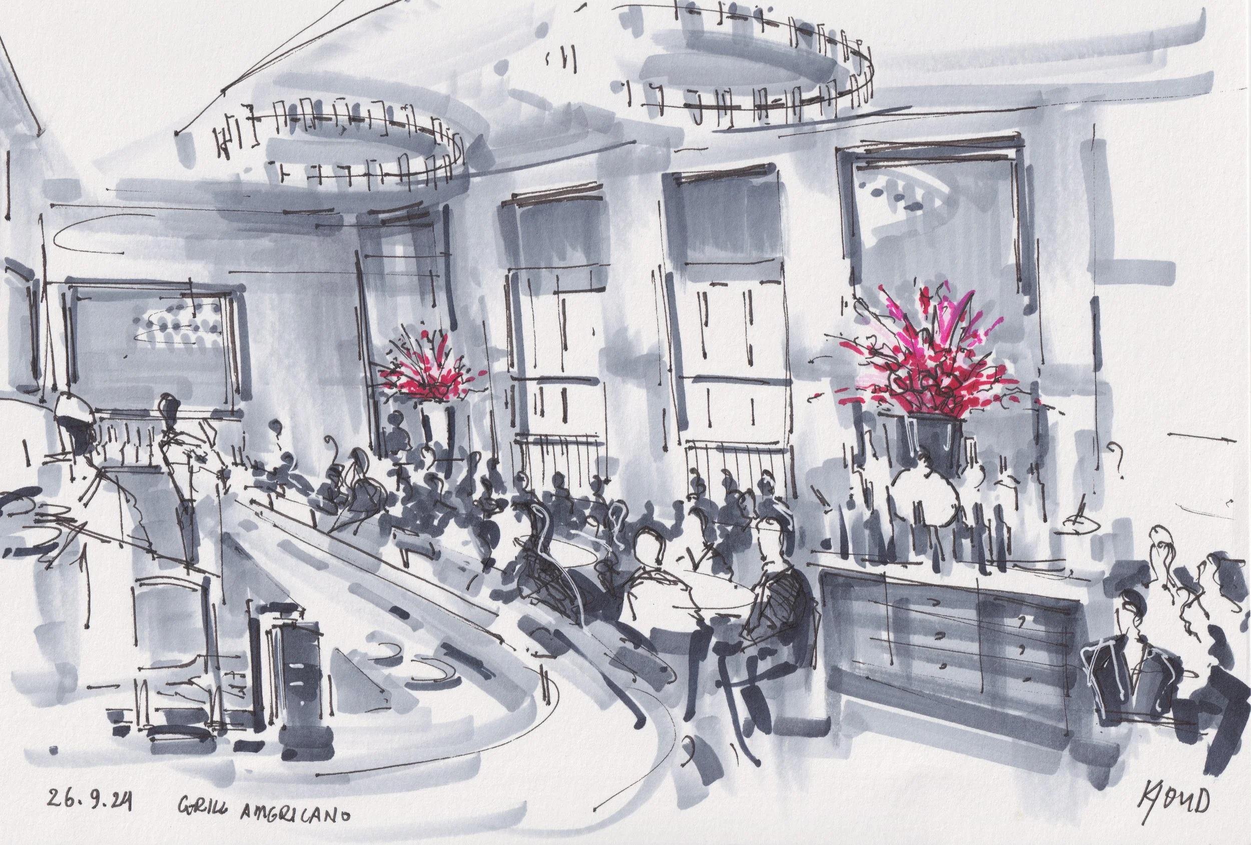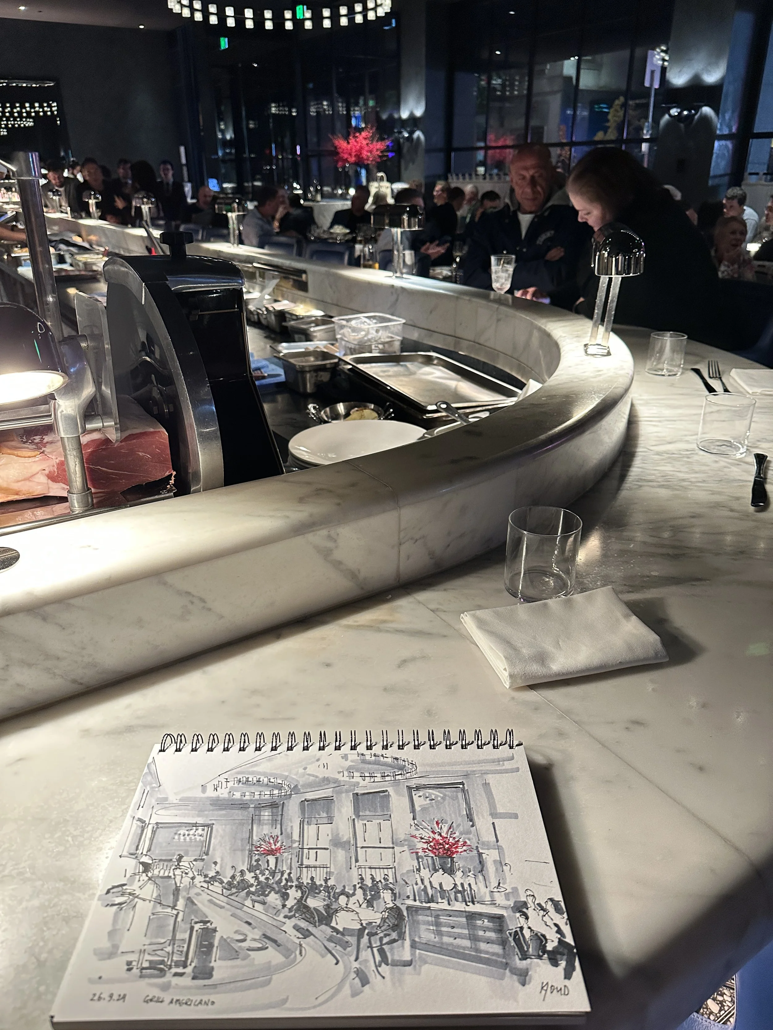 This artwork captures the essence of Grill Americano, a contemporary Italian steakhouse located in Melbourne's culinary heartland on Flinders Lane. Helmed by renowned restaurateur Chris Lucas, the restaurant offers a reimagined take on classic Italian grills and brasseries. The interior features a striking marble bar, dark features, and lofty ceilings, creating a chic and grand atmosphere reminiscent of New York elegance. At the heart of the kitchen is a custom-made wood-fire oven and Josper Grill, which impart a distinct smoky flavor to the exquisite meats and seafood. The menu showcases delicacies such as handmade pastas, specially procured beef including rare wagyu breeds, and classic Italian desserts.With a 2,000+ bottle cellar featuring classic producers and regions, Grill Americano offers a thoughtful wine collection to complement its offerings. This piece pays homage to the restaurant's blend of Italian elegance and Australian produce, capturing its essence in a visual narrative.
