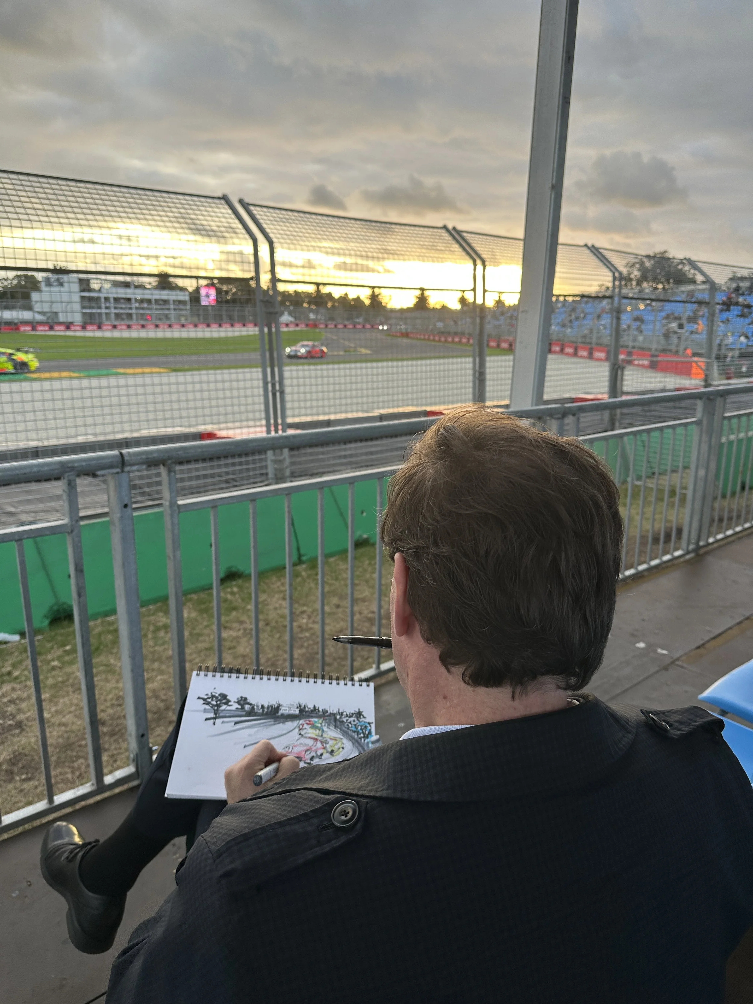 Artwork from F1 Melbourne 2023. This work was created on location at the AMG Mercedes stand after turn 10. By the end of the day the paper was so infused with brake pad dust, rubber and nitro fumes that when the work was being framed in the gallery it smelt like a car had driven past. Perhaps the art is still infused with a little F1 magic today.