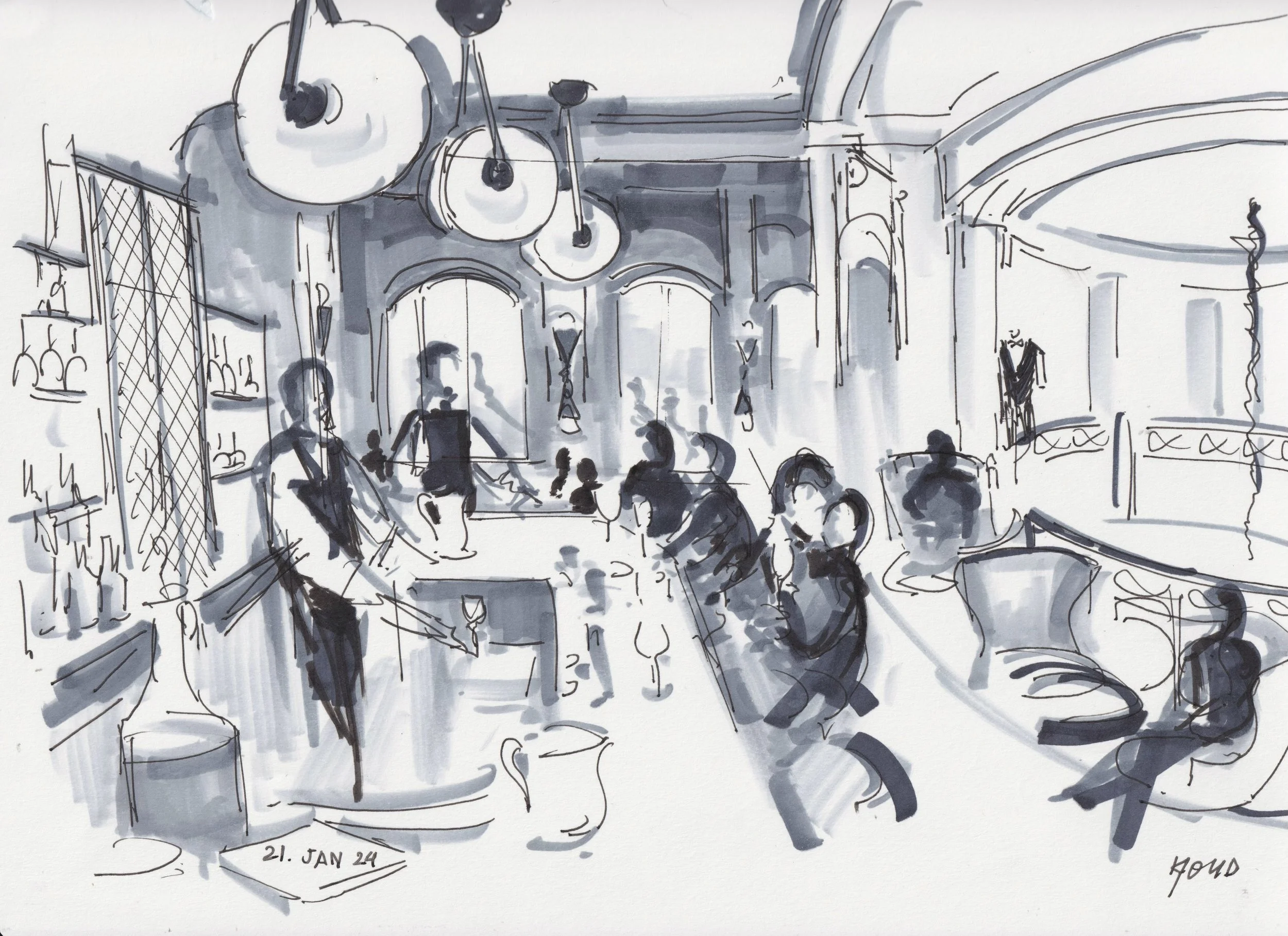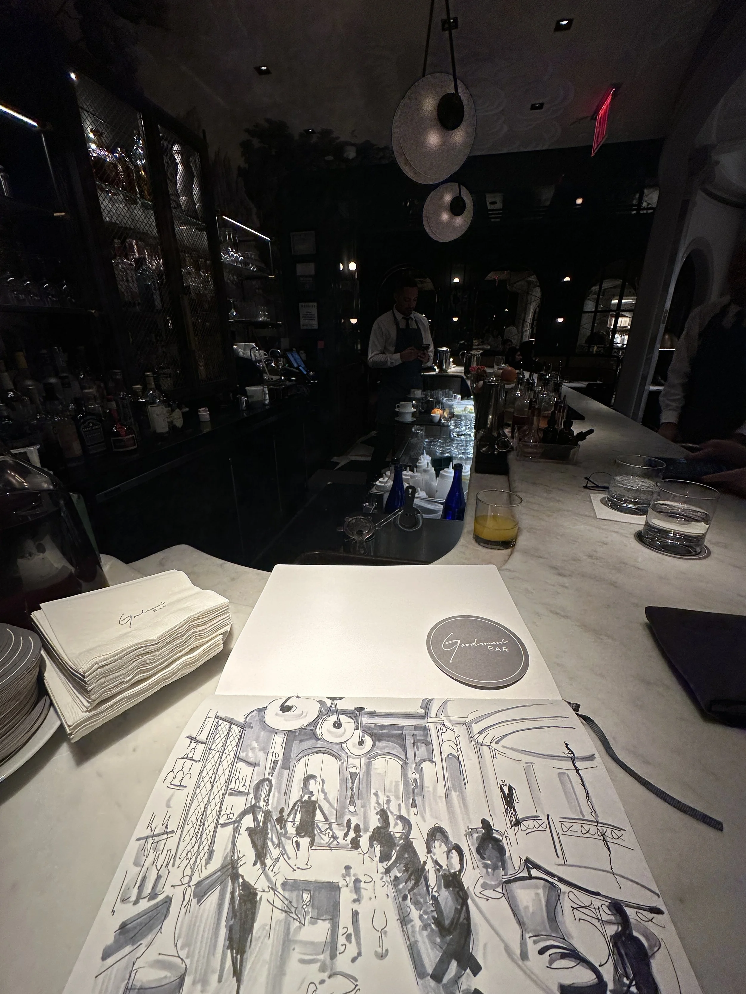 This artwork captures the refined ambiance of Goodman's Bar, an Art Deco-inspired brasserie nestled on the second floor of Bergdorf Goodman's Men's Store on Fifth Avenue. Designed as a hidden gem for discerning patrons, the bar offers a curated selection of crafted cocktails and classic fare with a contemporary twist. The painting reflects the intimate and stylish setting, inviting viewers to experience the timeless elegance and understated luxury that define this Midtown Manhattan destination.