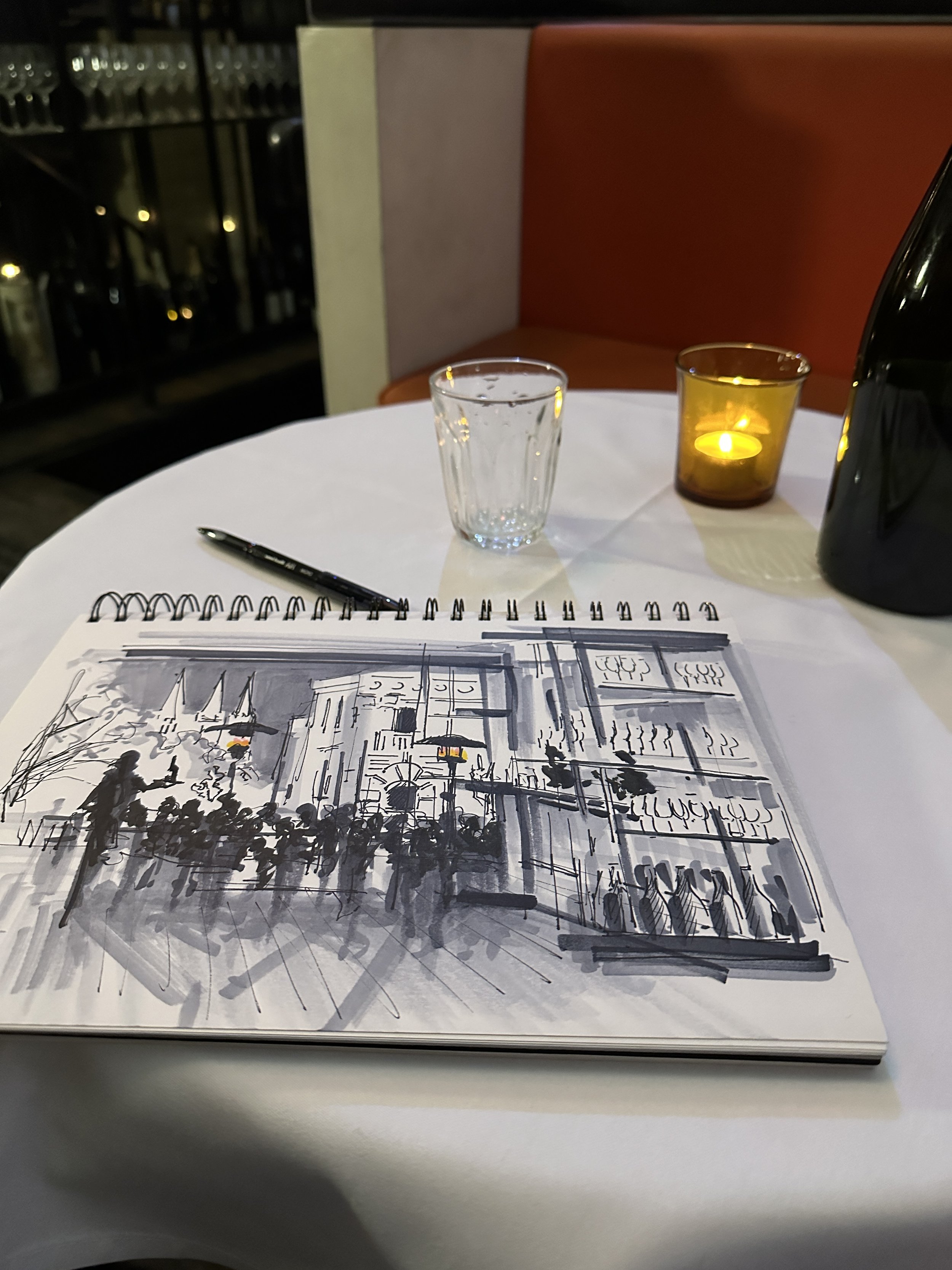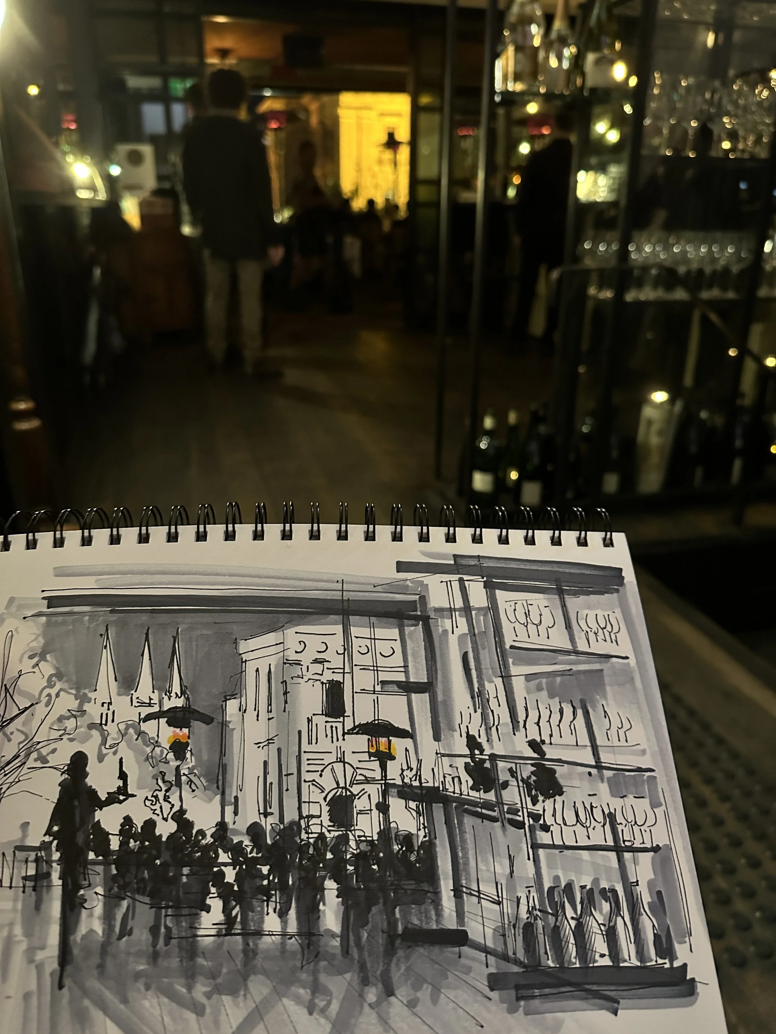 This drawing is made from the entry at the top of the stairs and captures part of the bar on the left as the viewer is invited to venture further into the piece and explore the views overlooking the Cathedral and Parliament House.