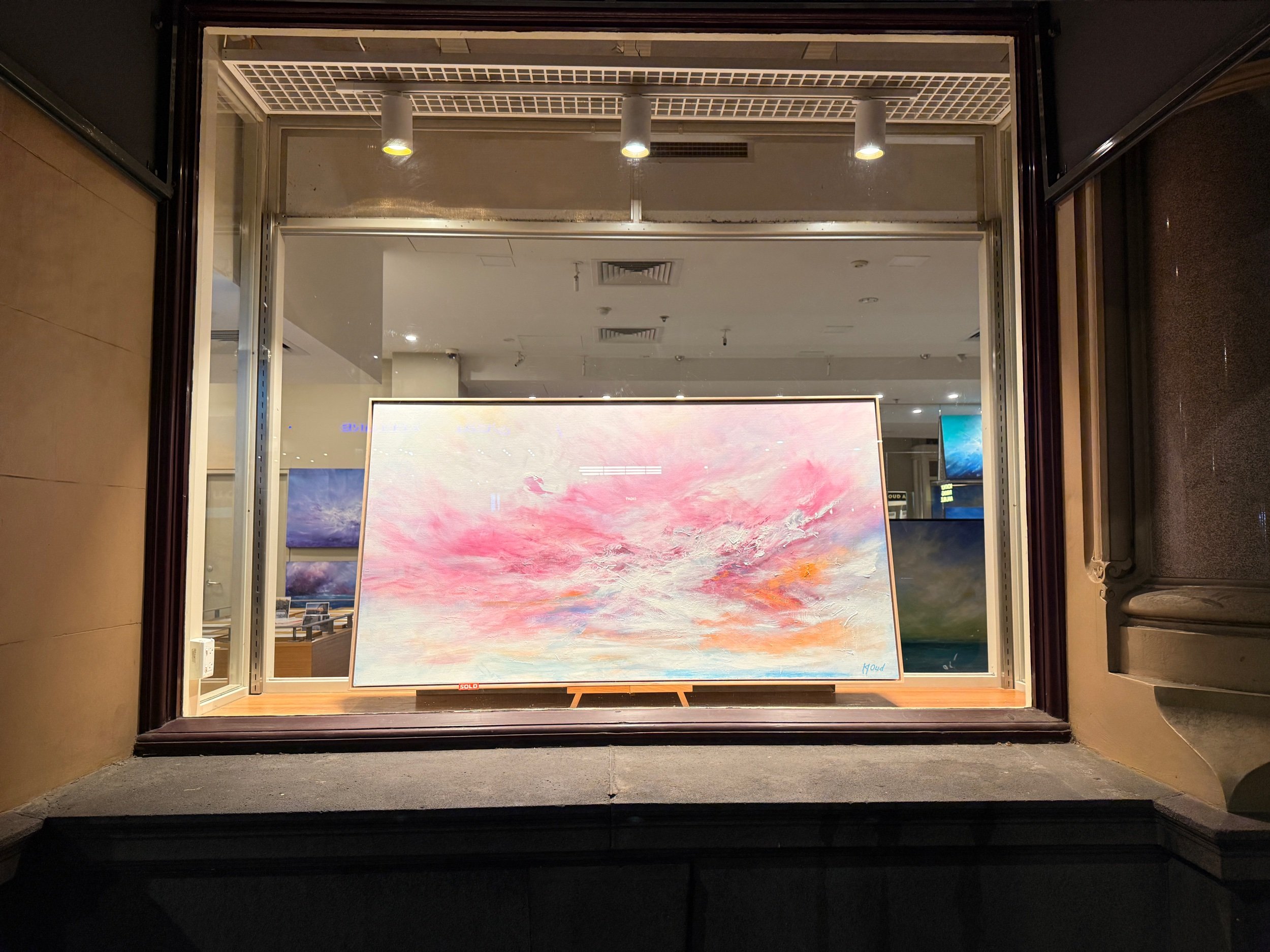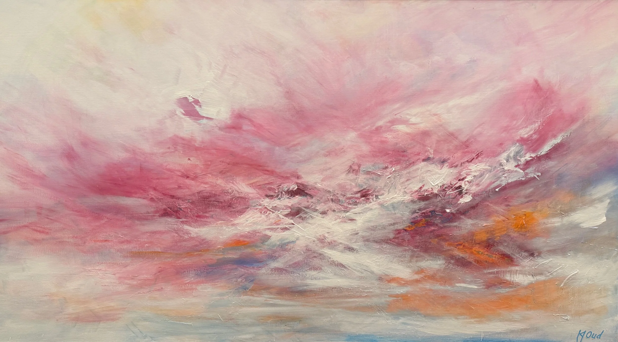 Eternal Skies explores the shifting relationship between light, atmosphere, and colour. Emerging from the lower right corner, Oud’s signature orange initiates the composition, drawing the eye across the canvas toward the deep magenta tones of a dissolving sunset.
